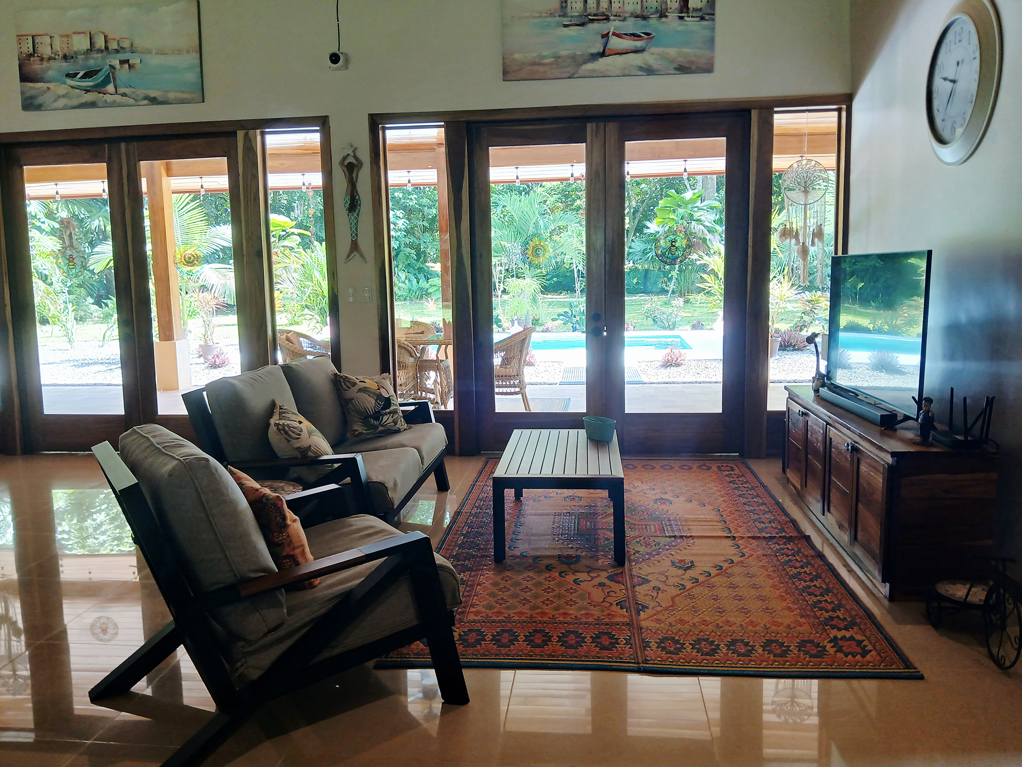 The spacious home features 3 air-conditioned bedrooms and 2 bathrooms, along with a laundry room, modern kitchen, and an open-concept living and dining area. Large glass sliding doors fill the space with natural light and open to the gardens, while ceiling fans and a water filtration system ensure everyday comfort. The house is fully furnished and equipped with new appliances, a new insulated roof designed for temperature and noise reduction, and elegant teak wood finishes.